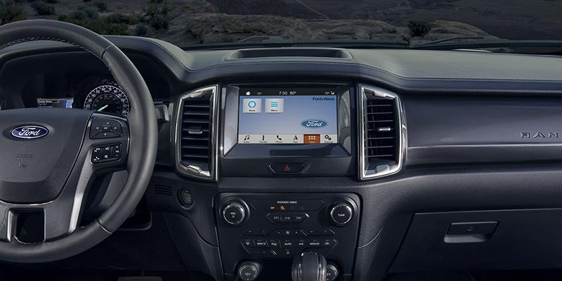 The 2020 Ranger's interior is packed with high-tech entertainment features like FordPass Connect 4G LTE WiFi, a six-speaker sound system which can be upgraded to 12 speakers, steering-wheel-mounted audio controls, and smart device integration via Apple CarPlay, Android Auto, and AppLink. Convenience features include an Intelligent Access proximity key with remote keyless entry, four 12-volt DC power outlets, 1-touch-down power windows, a GPS navigation system with voice activation, a pair of USB ports, a retained accessory power system, distance-pacing cruise control, 1 AC power outlet, and automatic dual-zone front air conditioning.