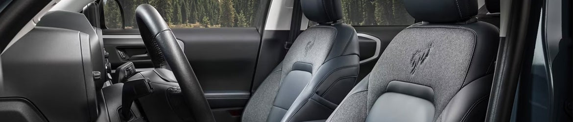 The Bronco® Sport SUV goes in prepared with durable surfaces and creative cargo areas, like the rear-flip-up glass feature. Experience the rush of the open air with the available power moonroof. Plenty of room with 65.2 cu. ft. of cargo* volume behind the first row. Standard on the Big Bend®, Heritage, and Bronco® Sport Free Wheeling™ and Outer Banks® models. Badlands® (shown) has an available cargo capacity of 60.6 cu. ft. behind the first-row. Ready for whatever the day brings. The 2024 Ford Bronco® Sport SUV has a durable, tough and available easy-to-clean interior. There’s room for your whole group. Every model has seating for up to five, with comfortable contoured bucket seats and ample interior space. Make room for your friends and your gear with a flexible interior and multiple places to store equipment. The extra height provided by the safari-style roof means more space for your stuff and lots of head room for tall friends. * There’s even enough cargo room to fit two bikes standing up when equipped with an available interior bike rack. If you need more room for storage, the Bronco® Sport Badlands® model offers additional space under the second-row passenger seat. Room for more. The second-row seats fold flat to expand your cargo area. When the seats are folded down, the Bronco® Sport Badlands® (shown) has an available cargo capacity of 60.6 cu. ft. behind the first-row. All other Bronco Sport models have an available 65.2 cu. ft., behind the first row.